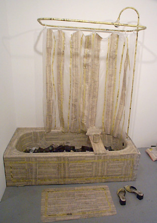 Cellphone Bonanza was exhibited in a group show called Speak and Spell, curated by Tory Franklin and held at SOIL Gallery. The intimate setting of a bathroom is used to display the omnipresence of cellphones. I covered real bathroom fixtures with phone book pages and had over 100 in-operable cell phone in the mix. I performed at the opening. People were invited to pick up a cellphone and ‘call’ me as I was sitting in the bathtub (right in front of them). I would not engage or talk with viewers unless I was ‘called’.